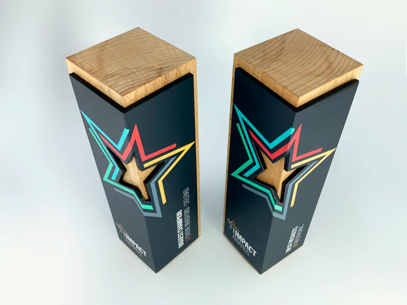 The Impact Award is incredibly versatile. It can be fully customised to reflect your own branding. Your branding is applied to two faces of the wooden block to create an award that is totally unique and reflects your brand perfectly. Made of heavyweight, sustainably sourced timber, it is sanded, waxed, and finished by hand and high quality black felt is applied to the base to protect your display surface.