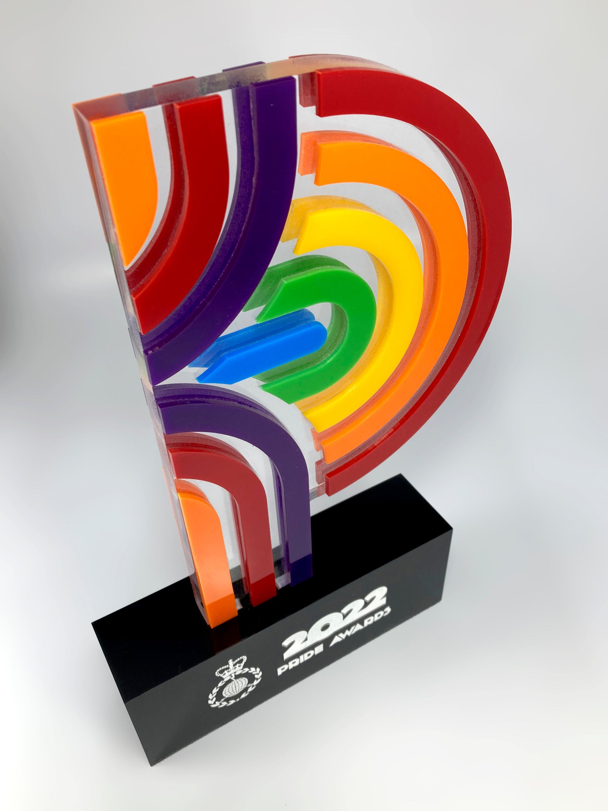 A celebration of colour and life meet in our Pride Award. Coloured and clear acrylic form the retro P-shaped body of the award inspired by the six-colour Pride Flag - one of the most well-known and -used LGBT flags throughout history.